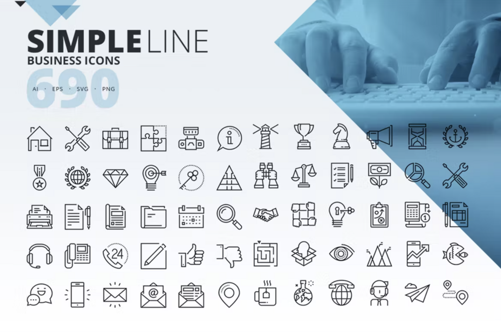 Features: • 690 Premium quality thin line icons • 23 Different categories of icons • Available in AI, EPS, PDF, SVG, PNG, JPG format • Easy to edit & customize • 100% resizable